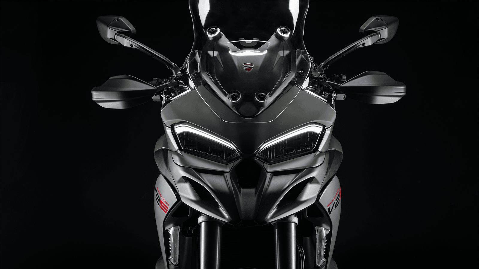 Yeni V2'deki aerodinamik deflektörler, motosikletin estetiğini ve işlevselliğini iyileştirerek tasarıma mükemmel bir şekilde entegre olur. Boyalı bölümle süreklilik içinde ön tarafa konumlandırılan deflektörler, aerodinamik konforu önemli ölçüde artırarak omuzlara kadar koruma sağlar. Yeni Multistrada V2'nin tasarımı, motosiklete sağlam ve dinamik bir görünüm kazandıran dengeli, yatay bir hacimle tipik aile oranlarını benimsiyor. Kuyruk bölümünde daha dar ve daha kompakt olan silüet, motosikleti öne doğru yansıtan, güç ve çevikliği ileten spor çizgilerle daha agresif bir ön taraf sağlıyor.