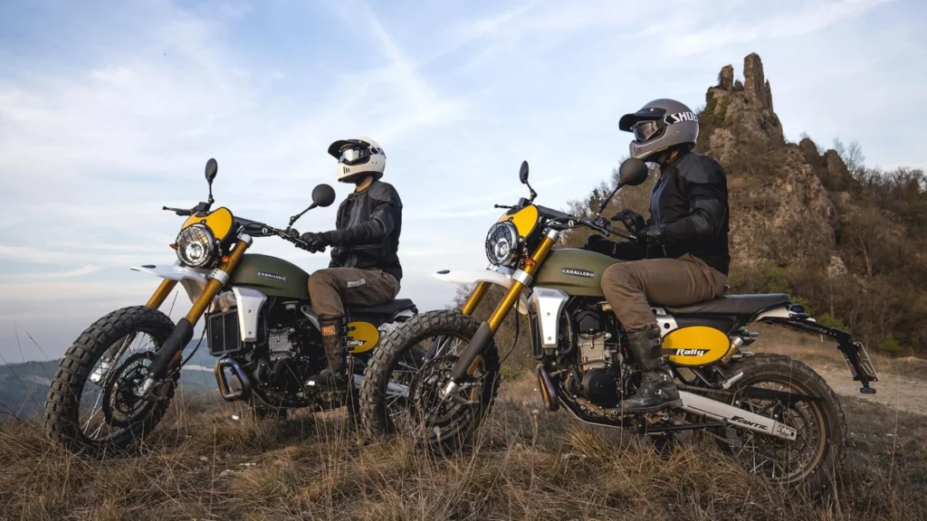 Caballero Rally birçok off-road detayı sunuyor: çapraz çubuklu gidon, ön çamurluk, motor koruma plakası, far koruma ızgarası, ön plaka, arazi lastikleri. Telli 19" ön ve 17" arka tekerlekler, Michelin Anakee Wild pürüzlü lastiklerin takılmasıyla daha da geliştirilmiş, ona gerçek bir scrambler görünümü veriyor. 320 mm'lik ön ve 230 mm'lik arka dalgalı fren diskleri ve devreden çıkarılabilir Continental çift kanallı ABS, her durumda mükemmel güvenliği garanti eder.